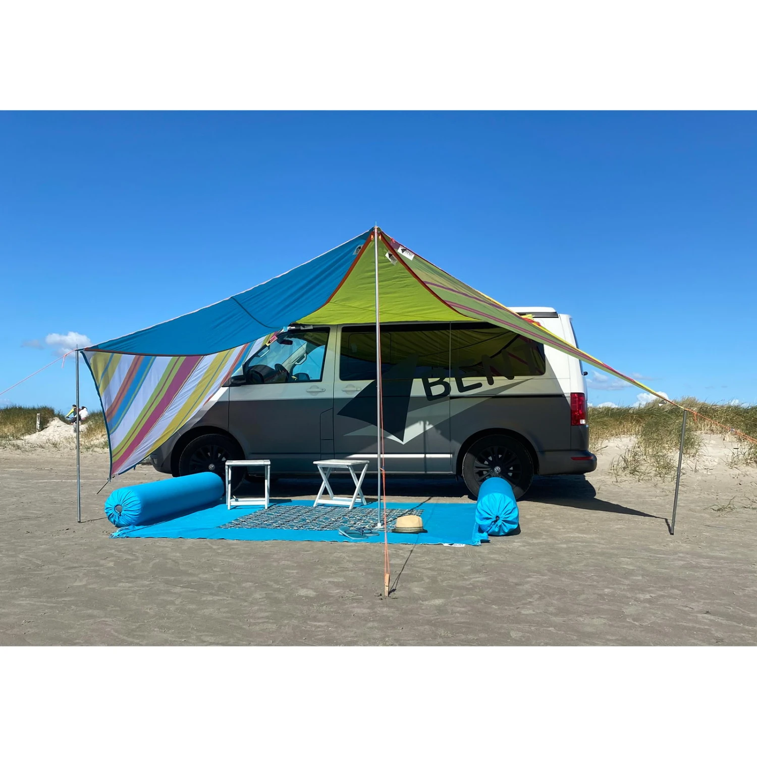 Das Sonnensegel Zip-Canvas von BENT aus der Linie Caribbean Style ist modular, funktional, variabel und glänzt durch einfache Handhabung, geringes Gewicht und kleines Packmaß. Ideal für Camping, Reisemobil, Caravaning, am Strand, im Garten, auf Festivals oder beim Chillen. Hergestellt aus robustem, PU-beschichtetem 150D Polyester-Gewebe mit einer Wassersäule von 1.500 mm und versiegelten Nähten. Das Gewebe hat einen UV-Schutz von 60 (Standard 801). Der UV-Standard 801 ist eines der weltweit strengsten Prüf- und Zertifizierungssysteme für Beschattungstextilien. BENT setzt sich bewusst für ökologische Nachhaltigkeit ein und vermeidet den Einsatz von umweltschädlichen Perfluorcarbonen (PFC) bei wasserabweisenden Beschichtungen. Das verbindbare Sonnensegel ist an den drei Seiten mit hochwertigen SBS Marken-Reißverschlüssen ausgestattet und bietet viele Möglichkeiten für den Aufbau einer modernen Lounge für den optimalen Wetterschutz. Die BENT Sonnensegel Zip-Canvas lassen sich in allen Richtungen verbinden, an– und umbauen, oder mit anderen BENT-Produkten, wie z.B. dem verbindbaren Teppich Zip-Carpet, durch Reißverschlüsse erweitern. Die gleichschenklige Dreieckskonstruktion und die verstärkte Eckenkonstruktion ermöglichen ein optimales Abspannen des Sonnensegels. Das Sonnensegel wird in einer praktischen, robusten Packtasche aus 150D Polyester mit Kordelzugverschluss, Schulterbändern und kleinem Packmaß für den einfachen Transport geliefert. Zusätzlich im Lieferumfang enthalten: 3 Abspannleinen mit Aluminium Dreilochspanner inkl. Beutel, Gestängetasche und Grundplatte für optionales Gestänge. Alle BENT Sonnensegel sind für den temporären Einsatz gedacht. Für die ganzjährige, dauerhafte, stationäre Beschattung nicht geeignet.