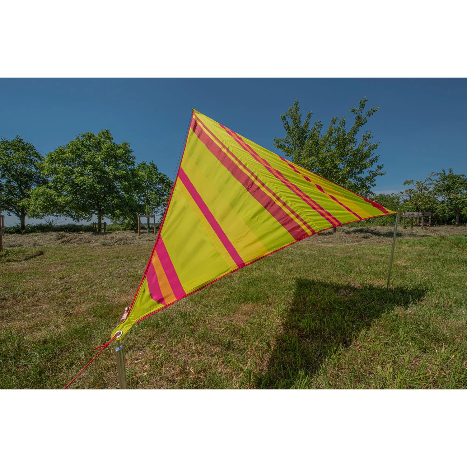 | Merkmale | 3 Abspannleinen mit (je Ø 4 mm x 350 cm) mit Aluminium Dreilochspanner, 3 verstärkte Ösen, inklusive Aufbewahrungsbeutel mit Kordelzugverschluss, inklusive Tasche und Grundplatte für optionales Gestänge, SBS Marken Reißverschluss Größe #10, UV 60 Schutz (Standard 801) |