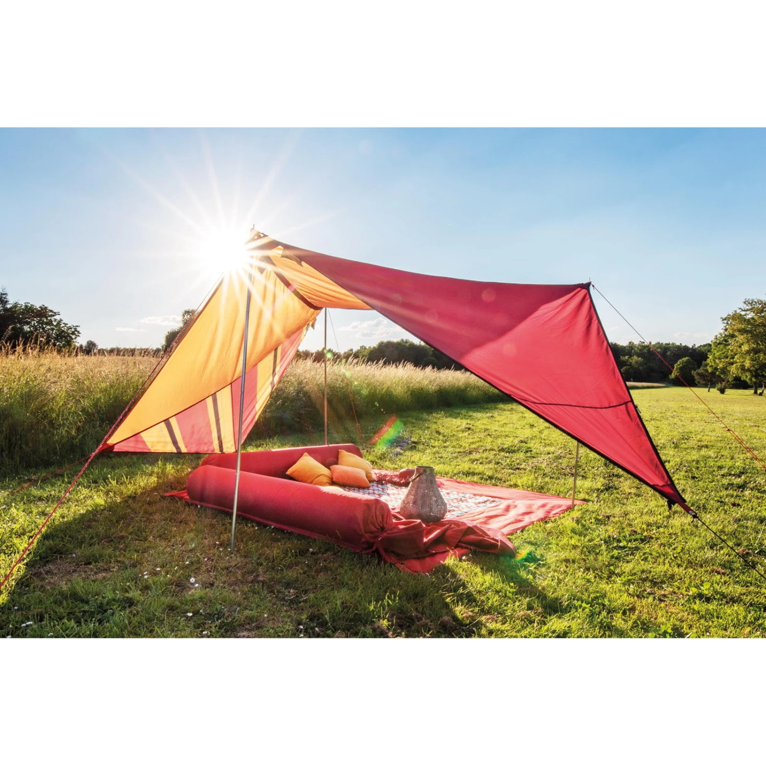 Das Sonnensegel Zip-Canvas von BENT aus der Linie Orient Style ist modular, funktional, variabel und glänzt durch einfache Handhabung, geringes Gewicht und kleines Packmaß. Ideal für Camping, Reisemobil, Caravaning, am Strand, im Garten, auf Festivals oder beim Chillen. Hergestellt aus robustem, PU-beschichtetem 150D Polyester-Gewebe mit einer Wassersäule von 1.500 mm und versiegelten Nähten. Das Gewebe hat einen UV-Schutz von 60 (Standard 801). Der UV-Standard 801 ist eines der weltweit strengsten Prüf- und Zertifizierungssysteme für Beschattungstextilien. BENT setzt sich bewusst für ökologische Nachhaltigkeit ein und vermeidet den Einsatz von umweltschädlichen Perfluorcarbonen (PFC) bei wasserabweisenden Beschichtungen. Das verbindbare Sonnensegel ist an den drei Seiten mit hochwertigen SBS Marken-Reißverschlüssen ausgestattet und bietet viele Möglichkeiten für den Aufbau einer modernen Lounge für den optimalen Wetterschutz. Die BENT Sonnensegel Zip-Canvas lassen sich in allen Richtungen verbinden, an– und umbauen, oder mit anderen BENT-Produkten, wie z.B. dem verbindbaren Teppich Zip-Carpet, durch Reißverschlüsse erweitern. Die gleichschenklige Dreieckskonstruktion und die verstärkte Eckenkonstruktion ermöglichen ein optimales Abspannen des Sonnensegels. Das Sonnensegel wird in einer praktischen, robusten Packtasche aus 150D Polyester mit Kordelzugverschluss, Schulterbändern und kleinem Packmaß für den einfachen Transport geliefert. Zusätzlich im Lieferumfang enthalten: 3 Abspannleinen mit Aluminium Dreilochspanner inkl. Beutel, Gestängetasche und Grundplatte für optionales Gestänge. Alle BENT Sonnensegel sind für den temporären Einsatz gedacht. Für die ganzjährige, dauerhafte, stationäre Beschattung nicht geeignet.