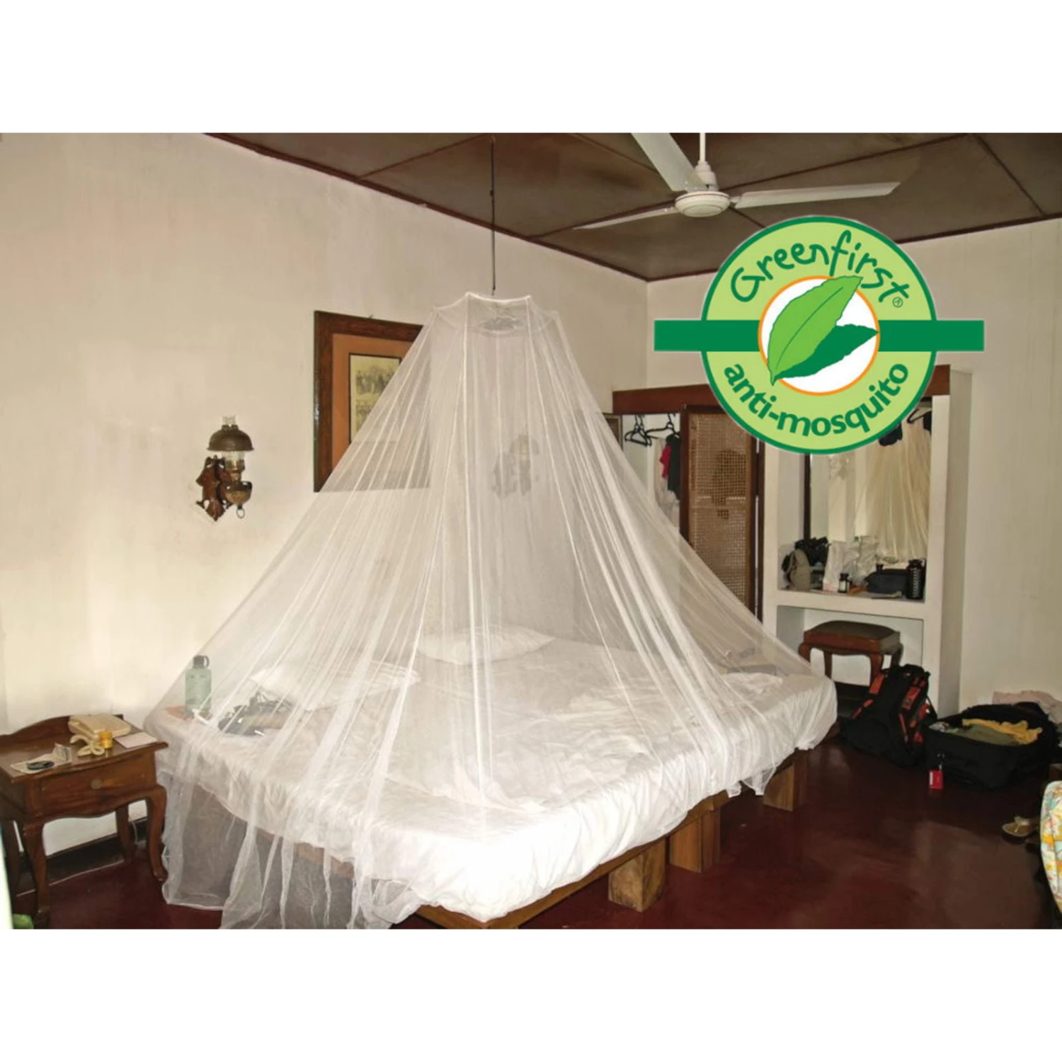 GREENFIRST ist eine pflanzlich, auf Basis ätherischer Öle und Geraniol zusammengesetze Imprägnierung und dient lediglich der Abwehr der Mücken. Die Imprägnierung ist hypoallergen und biologisch abbaubar. Auch nach fünf Monaten Verwendung hält die Imprägnierung Stechmücken mit einer Wirksamkeit von 95% weiterhin zuverlässig fern. Waschen des Netzes verringert die Wirksamkeit, kann aber mit dem GREENFIRST anti-mosquite Spray (als Zubehör erhältlich) erneuert werden. Gemäß der Biozig Regulation 528/2012 für den EU Markt zugelassen, Reg.-Nr. 69682. Nach OEKO-TEX Standard 100 zertifiziert.