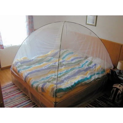 Freistehendes Moskitonetz. Schnell über Betten oder auf dem Boden aufzustellen. Glasfibergestänge mit innenliegenden Spanngurten und Klammern. Kann variabel in den Breiten von 80 bis 200 cm aufgebaut werden, wobei das Netz bei einer Bettbreite von über 160 cm nicht mehr weit über die Matratze reicht und dann eher für den Boden gedacht ist. Das Moskitonetz selbst ist so komzipiert, dass es in der größtmöglichen Breite über das Gestänge passt. Es schließt daher oben im Kopfbereich nicht enganliegend mit dem Gestänge ab sondern hat genügend Spielraum, um es den geforderten Gegebenheiten anzupassen. Das Moskitonetz hat keinen seitlichen Eingang, man hebt es kurz an um unter das Netz zu kommen. Ein zusätzlicher Eingang birgt die Gefahr, dass man diesen aus Versehen nicht schließt und somit Mücken und andere Flugwesen in das Netz gelangen können.