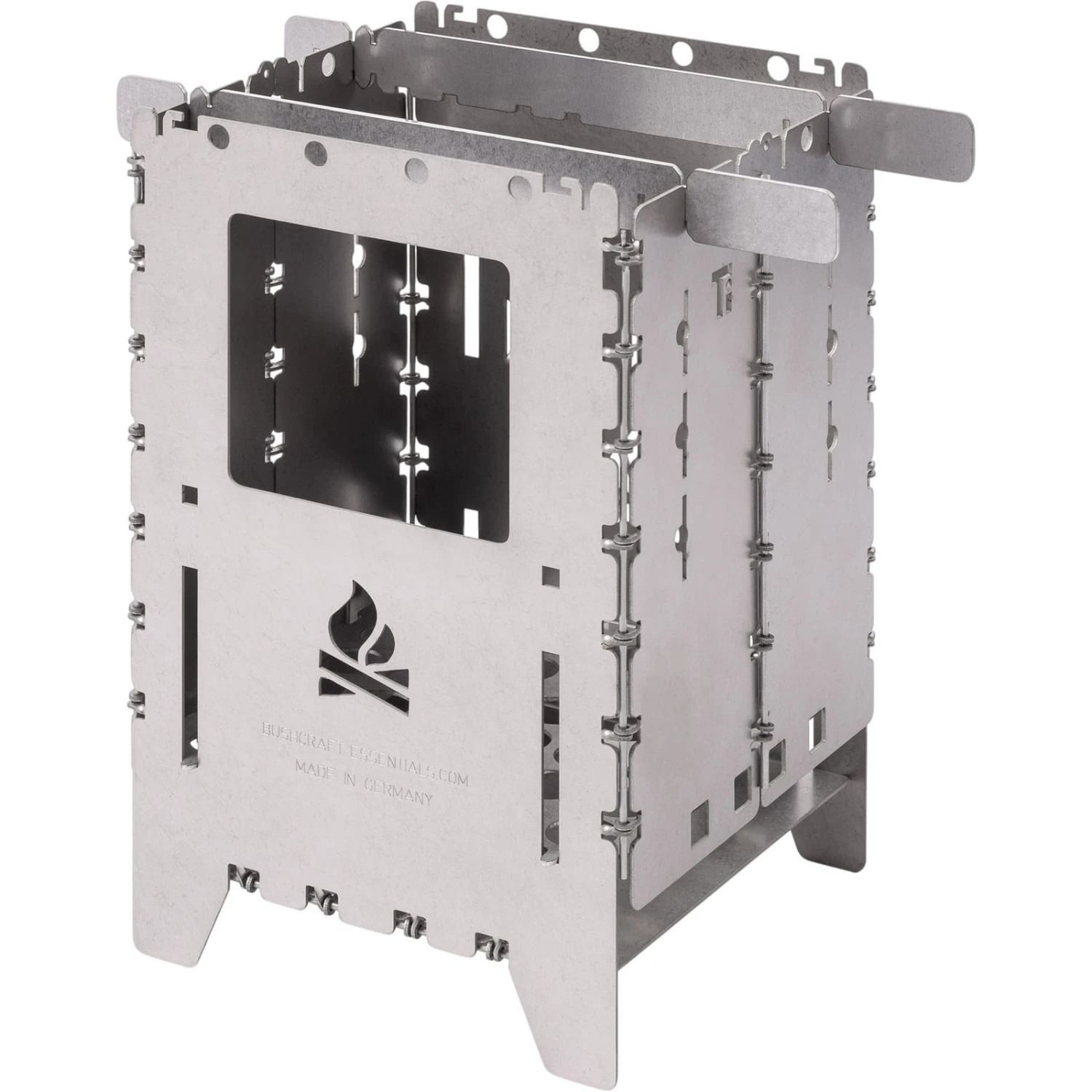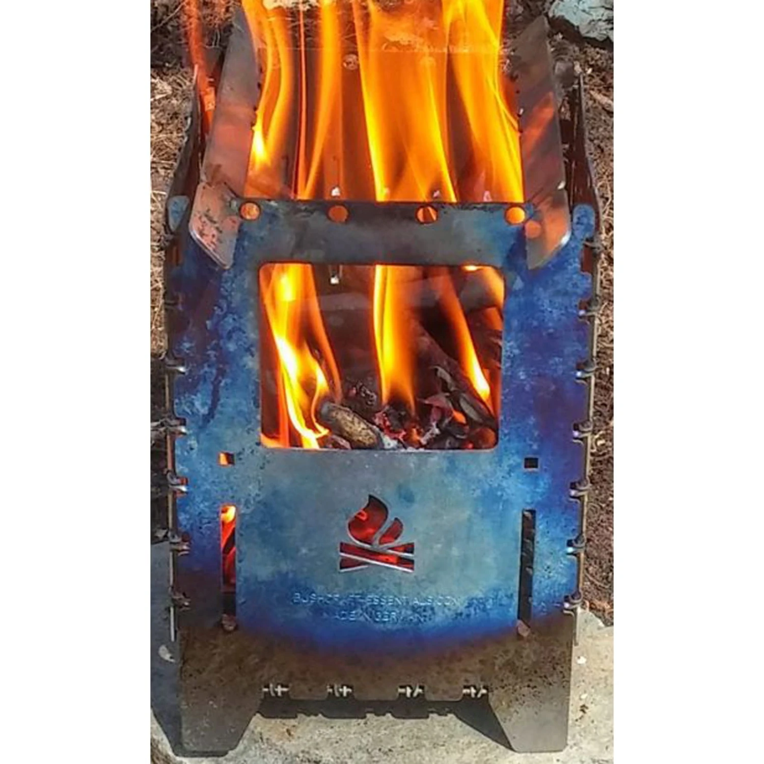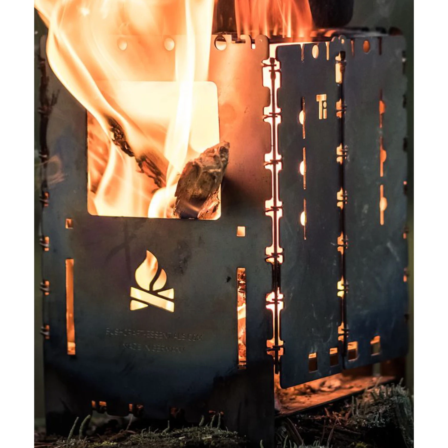 Der Bushbox XL in Titan-Ausführung von bushcraft essentials ist ein außerordentlich effizienter portabler Falt-Hobo-Kocher zum Grillen, Kochen, Wärmen. Zusammengefaltet nur ca. 1 cm dick. Perfekt für längere Outdoor-Trips, Camping, Trekking, Bushcraft, Biker, Expeditionen und und und… Unabhängig, vielfältig und einfach zu benutzen. Den Brennstoff gibt es kostenlos überall in der Natur – Zweige, Äste, Laub, Tierdung. Halteposition für Trangia Kocher. Zusammengeklappt ist dieser geniale Hobo-Ofen nur wenig dicker als 1 cm und lässt sich nahezu überall unterbringen. Der Bushbox XL Titanium wird an den Scharnieren einfach aufgeklappt und ist sofort einsatzbereit (er lässt sich auch mit Handschuhen oder klammen Händen problemlos aufbauen, was bereits auf Expeditionen unter Beweis gestellt wurde). Der Bushbox XL Titanium arbeitet nach dem Kamin-Prinzip: Luft strömt von unten in den Kocher, bringt sogar noch feuchtes Material zum Brennen und erzeugt starke Hitze, was weiter dadurch unterstützt wird, dass die Hitze im Gegensatz zu einer offenen Flamme kaum nach den Seiten abstrahlen kann und dadurch vorwiegend nach oben gelenkt wird. Der Bushbox XL Titanium ist ein Effizienzwunder. Schon mit wenigen kleinen Zweigen lässt sich Wasser in unter 4 Minuten zum Kochen bringen, Fleisch grillen, Essen zubereiten – und vieles mehr. Als Brennstoff kann neben praktisch jedem natürlichen bzw. festen Brennstoff wie Holz, Rinde, Holzkohle (sogar trockner Tierdung) auch ein Spiritusbrenner, Esbit-Tabletten oder ein Gel-Kocher verwendet werden. Durch zwei mitgelieferte Stäbe (aus Edelstahl) kann eine externe Wärmequelle (z.B. Trangia) auf jeder beliebigen Höhe in der Bushbox XL plaziert werden. Diese Stäbe lassen sich auch auf der Oberseite des Kochers einlegen, so dass auch kleine Gefäße erhitzt werden können. Die mitgelieferten, äußerst variabel einsetzbaren Topfauflagen können alternativ verwendet werden als Höhenregulierung beim Einsatz anderer Wärmequellen, Haltestäbe zum Transport oder Versetzen des heißen Kochers und Halterung für den Trangia-Brenner.