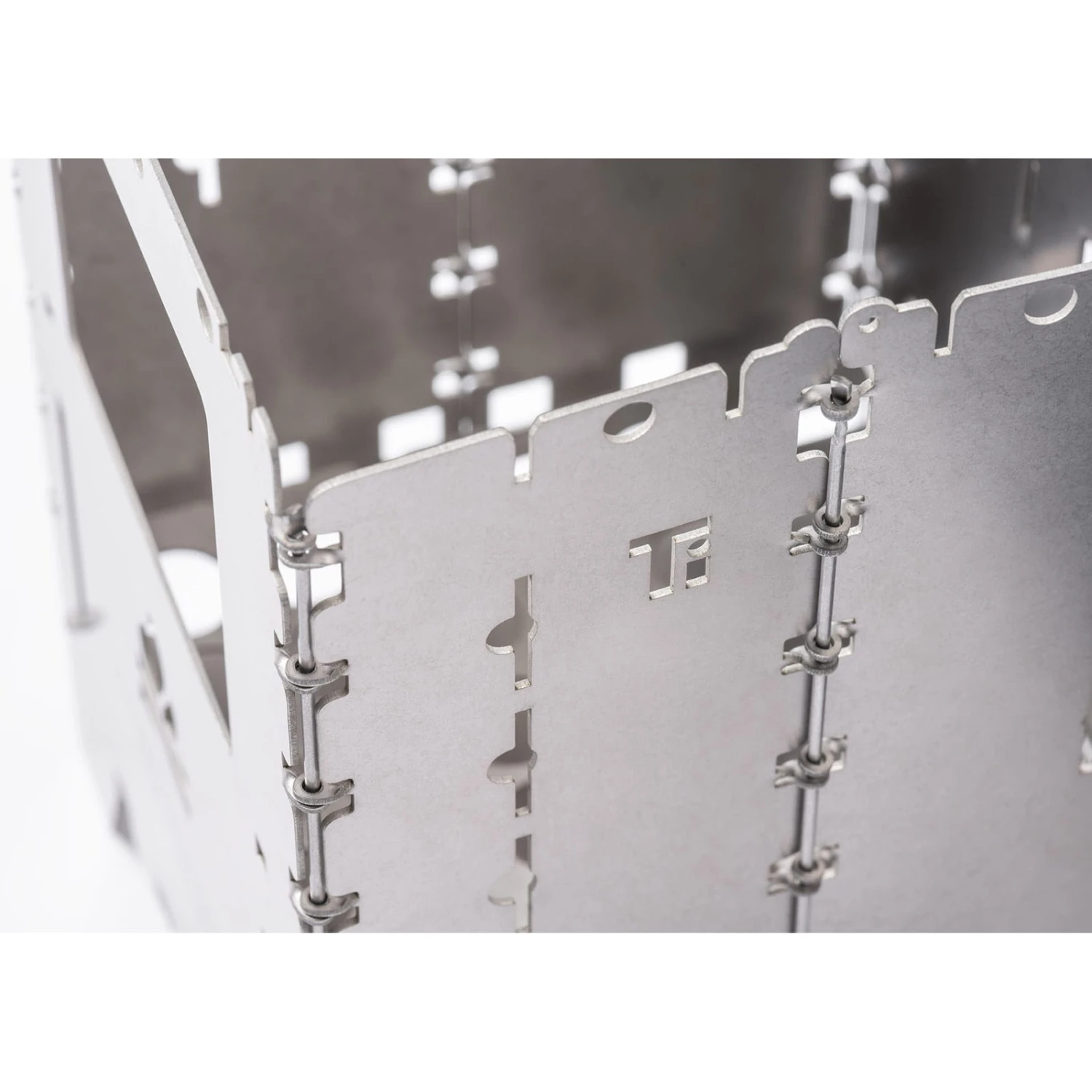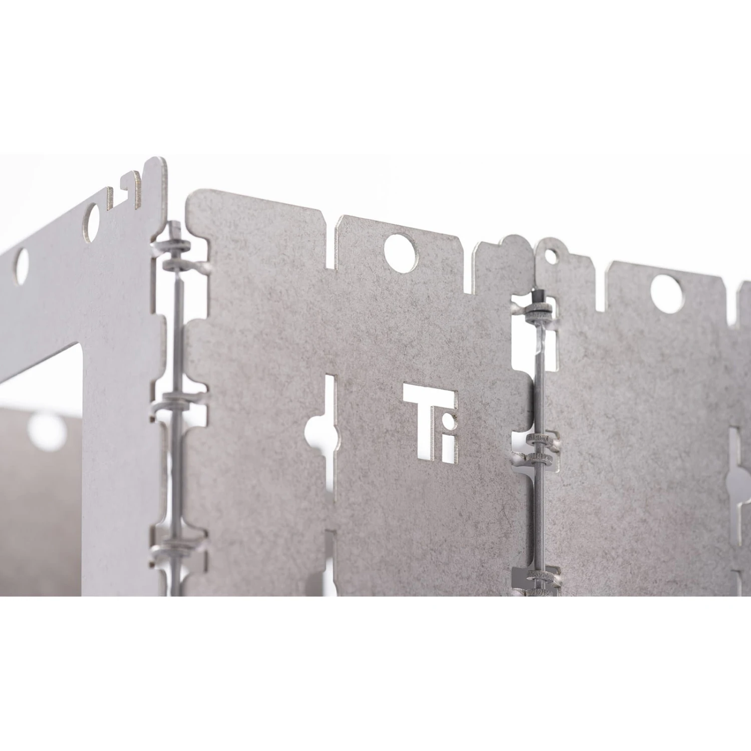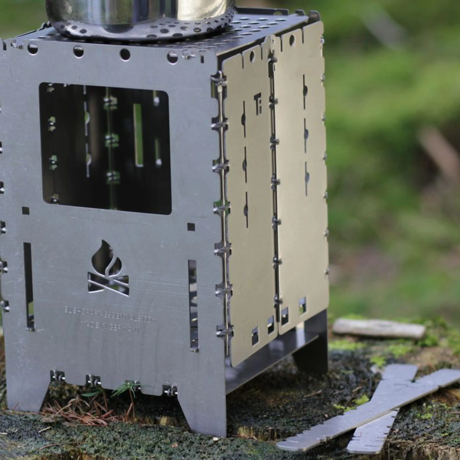 Der Bushbox XL in Titan-Ausführung von bushcraft essentials ist ein außerordentlich effizienter portabler Falt-Hobo-Kocher zum Grillen, Kochen, Wärmen. Zusammengefaltet nur ca. 1 cm dick. Perfekt für längere Outdoor-Trips, Camping, Trekking, Bushcraft, Biker, Expeditionen und und und… Unabhängig, vielfältig und einfach zu benutzen. Den Brennstoff gibt es kostenlos überall in der Natur – Zweige, Äste, Laub, Tierdung. Halteposition für Trangia Kocher. Zusammengeklappt ist dieser geniale Hobo-Ofen nur wenig dicker als 1 cm und lässt sich nahezu überall unterbringen. Der Bushbox XL Titanium wird an den Scharnieren einfach aufgeklappt und ist sofort einsatzbereit (er lässt sich auch mit Handschuhen oder klammen Händen problemlos aufbauen, was bereits auf Expeditionen unter Beweis gestellt wurde). Der Bushbox XL Titanium arbeitet nach dem Kamin-Prinzip: Luft strömt von unten in den Kocher, bringt sogar noch feuchtes Material zum Brennen und erzeugt starke Hitze, was weiter dadurch unterstützt wird, dass die Hitze im Gegensatz zu einer offenen Flamme kaum nach den Seiten abstrahlen kann und dadurch vorwiegend nach oben gelenkt wird. Der Bushbox XL Titanium ist ein Effizienzwunder. Schon mit wenigen kleinen Zweigen lässt sich Wasser in unter 4 Minuten zum Kochen bringen, Fleisch grillen, Essen zubereiten – und vieles mehr. Als Brennstoff kann neben praktisch jedem natürlichen bzw. festen Brennstoff wie Holz, Rinde, Holzkohle (sogar trockner Tierdung) auch ein Spiritusbrenner, Esbit-Tabletten oder ein Gel-Kocher verwendet werden. Durch zwei mitgelieferte Stäbe (aus Edelstahl) kann eine externe Wärmequelle (z.B. Trangia) auf jeder beliebigen Höhe in der Bushbox XL plaziert werden. Diese Stäbe lassen sich auch auf der Oberseite des Kochers einlegen, so dass auch kleine Gefäße erhitzt werden können. Die mitgelieferten, äußerst variabel einsetzbaren Topfauflagen können alternativ verwendet werden als Höhenregulierung beim Einsatz anderer Wärmequellen, Haltestäbe zum Transport oder Versetzen des heißen Kochers und Halterung für den Trangia-Brenner.