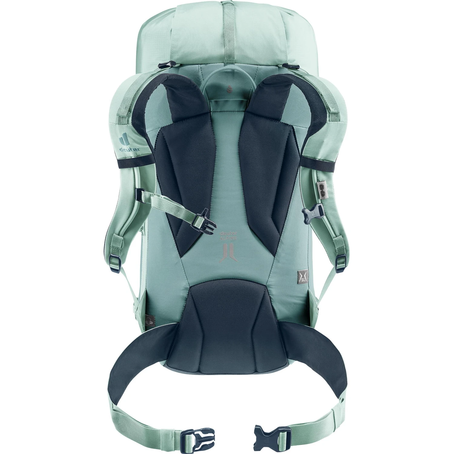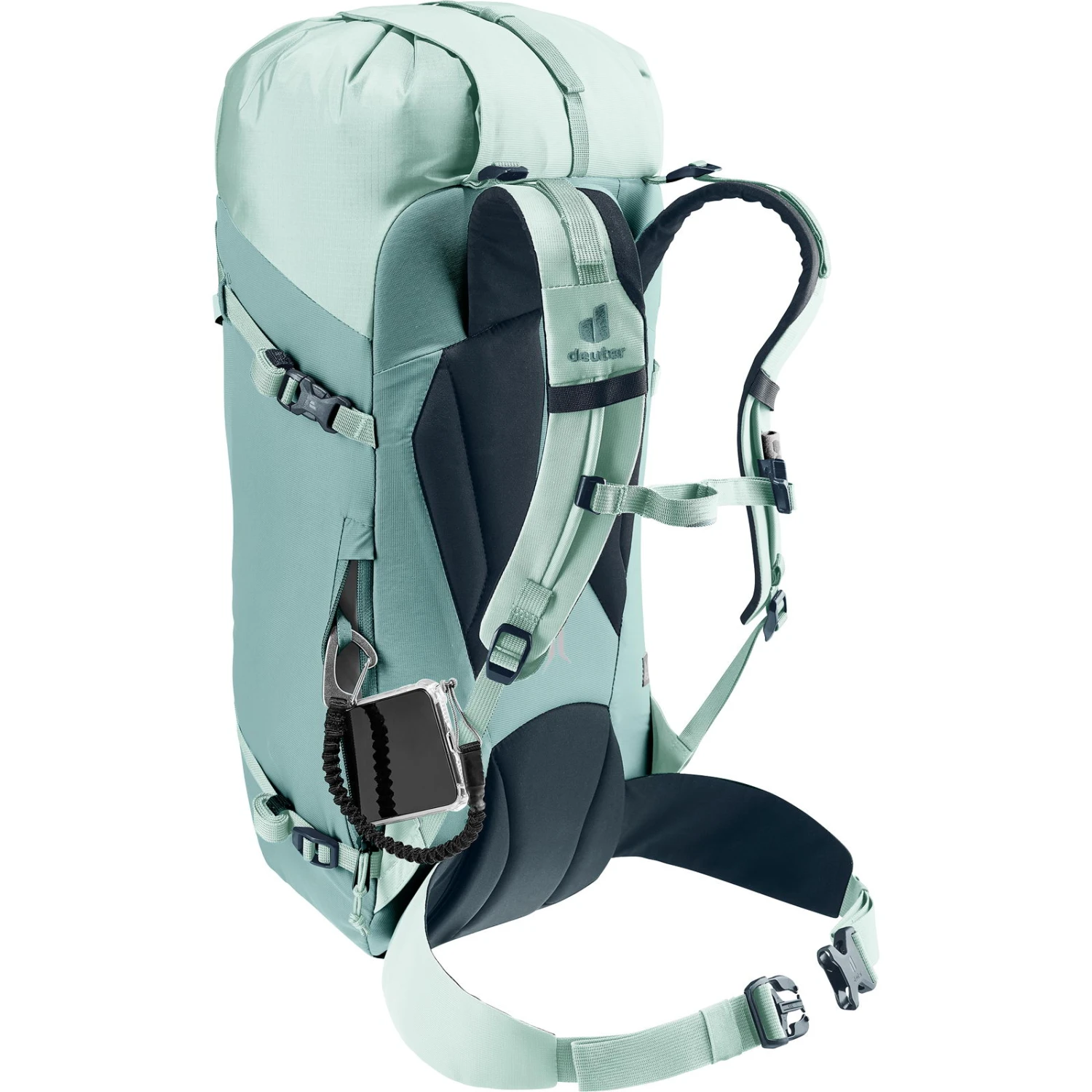 Der Guide 28 SL von deuter für Damen überzeugt durch geringes Gewicht, klares Design und zuverlässiges Handling bei anspruchsvollen alpinen und hochalpinen Unternehmungen. Selbst harte Einsätze im rauen Fels übersteht der Tourenrucksack dank robuster Materialien und hochwertiger Verarbeitung mühelos. Das schlanke Alpine Tragesystem kombiniert einen festen, sicheren Sitz mit höchstem Tragekomfort und angenehmer Belüftung zwischen den beiden Softstripe-Rückenpolstern. Die anschmiegsamen Rückenpolster halten das Gewicht der Ladung sicher und kontrollierbar nah am Körperschwerpunkt für ein gutes Gleichgewicht in anspruchsvollen Passagen. Die neuartige Deckelkonstruktion mit Kordelverschluss und Fast-Acess ermöglicht einen besonders schnellen Zugriff auf das Hauptfach. Bei Regenwetter kann das Gepäck mit der Abdeckung zusätzlich geschützt werden. Die seitlich verstaubaren Hüftflossen sorgen nicht nur für ein hervorragendes Verhältnis von Tragekomfort zu Gewicht, sondern ermöglichen auch vielseitige Einsatzmöglichkeiten des Rucksacks sowie das Tragen eines Klettergurts. Seitliche Kompressionsriemen regulieren das Volumen und halten so das Gewicht nah am Körper. Ausgefeilte Befestigungsmöglichkeiten für Pickel, Eisgerät, Stöcke und Helm sowie die verstaubare Seilfixierung machen den Rucksack zum Klassiker für anspruchsvolle alpine Touren. Durch das in der Abdeckung integrierte, abnehmbare Helmnetz kann der Helm je nach Bedarf entweder oben am Deckel oder an vorne am Rucksack befestigt werden. Darüber hinaus gibt es weitere Taschen und Fächer für Wertsachen oder zusätzliche Ausrüstung sowie Platz für ein Trinksystem.
