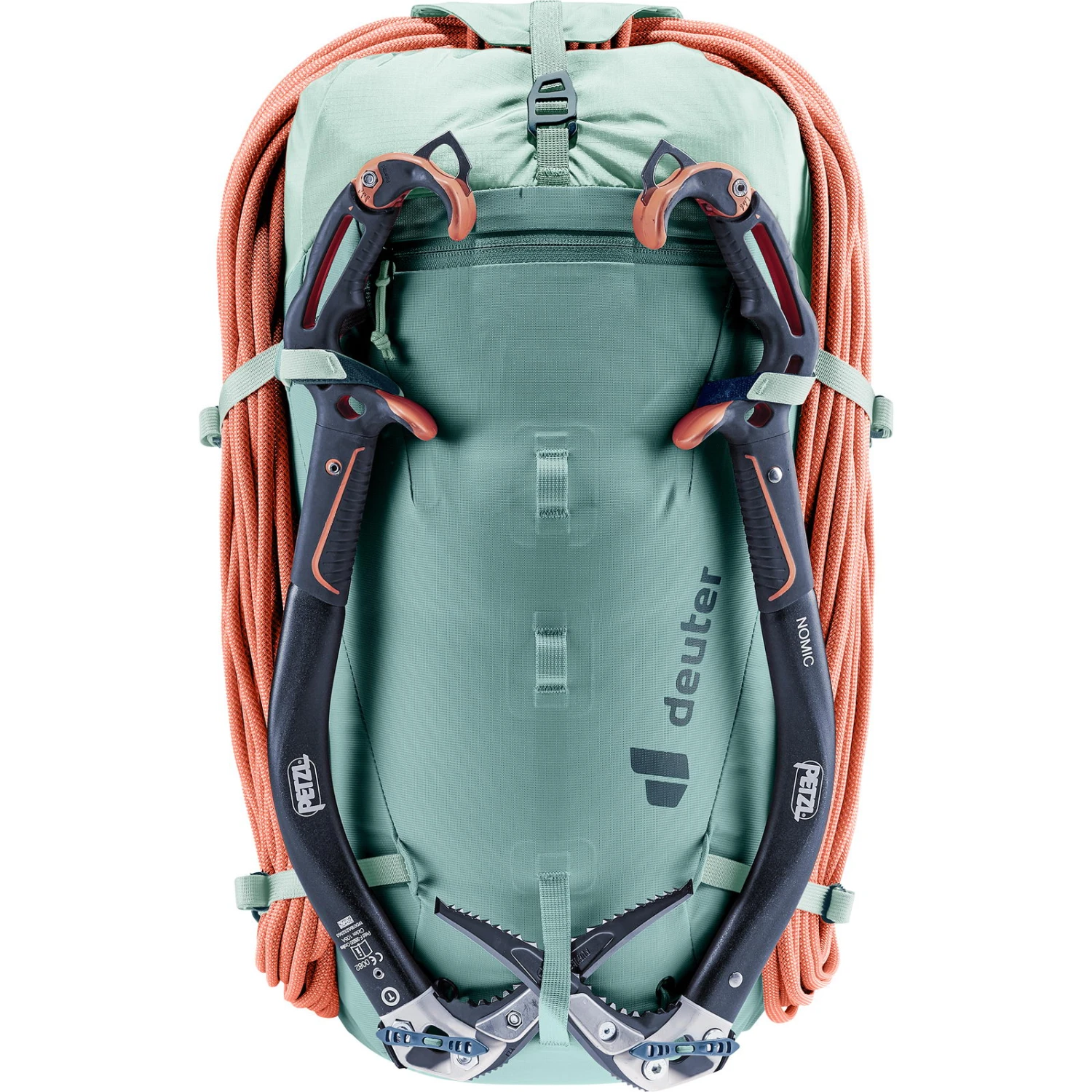 | Merkmale | abnehmbares Helmnetz im Deckelfach innen, Brustgurt mit Signalpfeife, eine Seitentasche mit Reißverschluss, einfacher Bauchgurt, Einschubfach innen, Eisgerätehalterung, Halterung für Trinkblase, höhenverstellbarer Brustgurt, Lastkontrollriemen, Materialschlaufen auf den Schulterträgern für Brille etc., Pickelhalterung, Reißverschlussfach vorne, Schlauchdurchführung für Trinksystem, Schlüsselhalterung, Seilfixierung unter der Hauptfachabdeckung, seitliche Kompressionsriemen, SOS Notfallhinweise, Stockhalterung, Trageschlaufe hinten oben, verstaubare Hüftflossen |