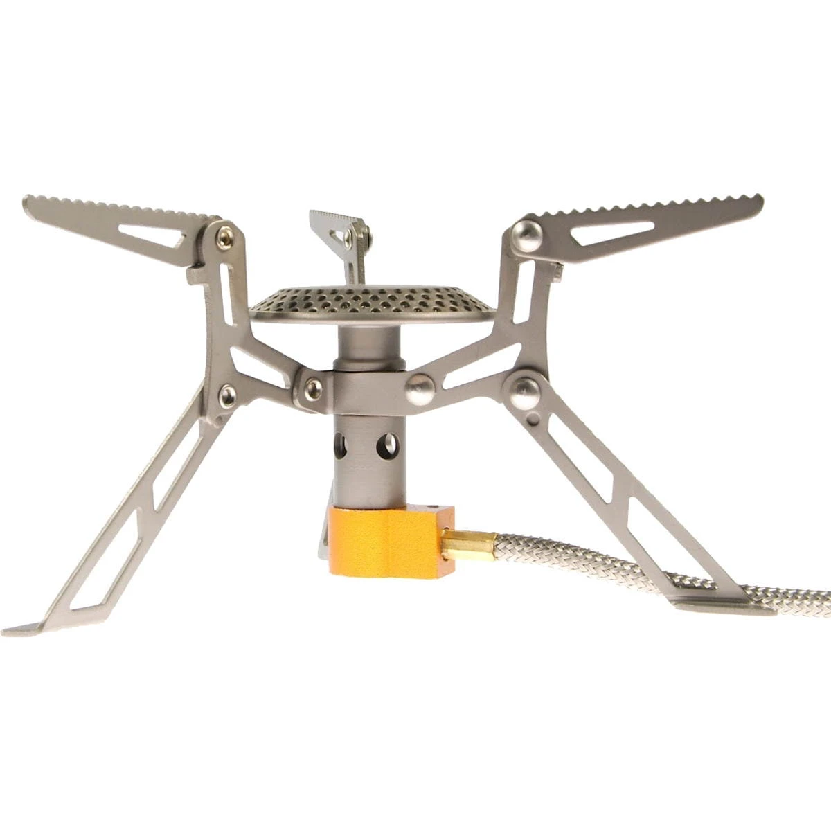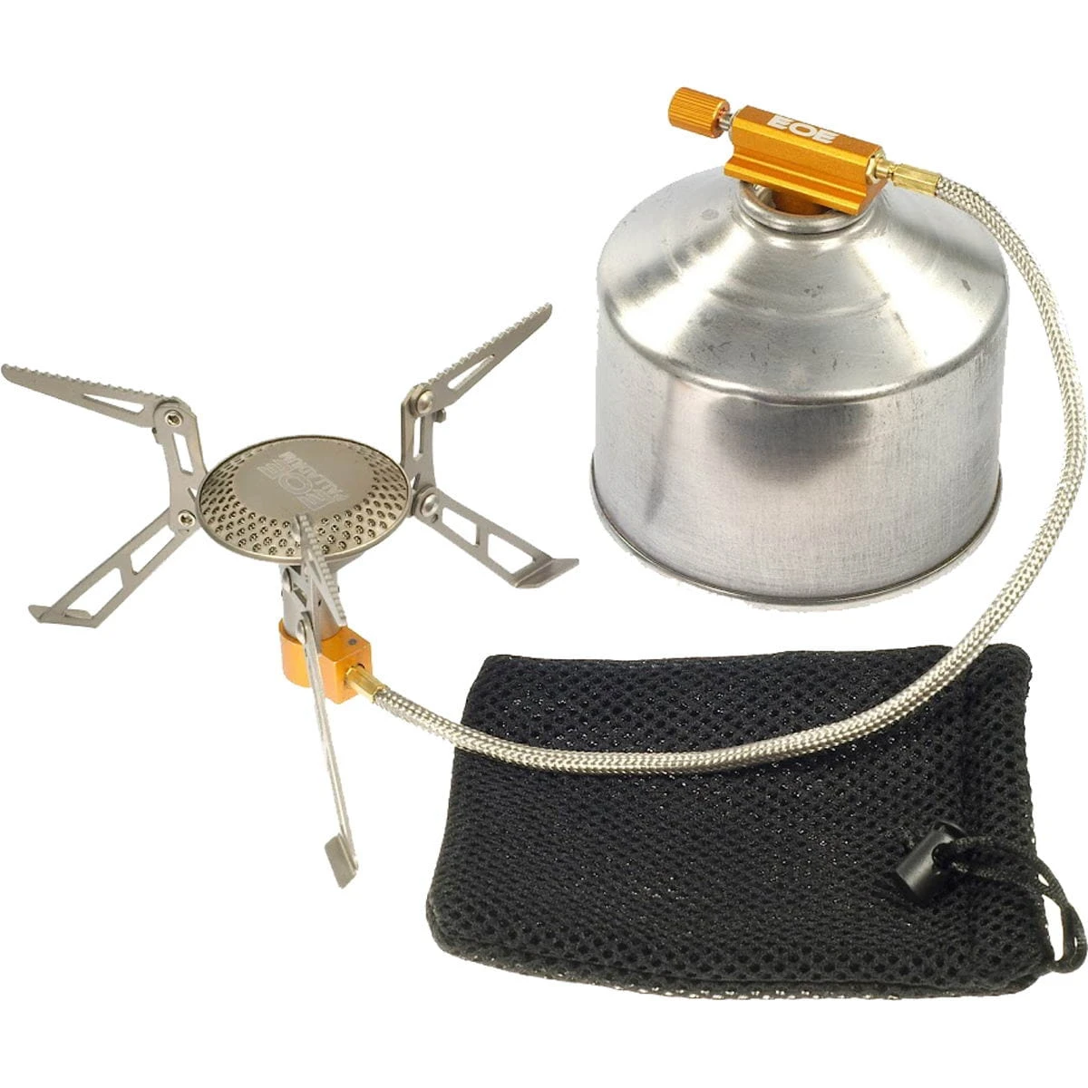 Der EOE Palladium ist mit 98 g einer der leichtesten Kocher mit Schlauchleitung auf dem Markt. Der Schwerpunkt verlagert sich deutlich nach unten, indem der Kocher nicht direkt auf eine Kartusche geschraubt wird. Dadurch ist die ganze Konstruktion erheblich standfester, gerade bei der Verwendung von großen und schweren Töpfen. Die Flamme ist direkt am Ventil an der Kartusche sehr fein regulierbar. Durch die Verwendung leichtester und edelster Materialien wie Titan ist der Gaskocher extrem leicht und läßt sich durch seine zusammenklappbaren Beine sehr klein zusammenfalten. Er paßt damit zusammen mit einer 230g Kartusche in die meisten Töpfe und ist somit ideal für Radfahrer, Paddler oder Wanderer, die ihr Gepäck klein verstauen müssen. Auf den Palladium Gaskocher passen alle Schraubkartuschen (DIN EN 417) aller namhaften Hersteller und so ist für Nachschub weltweit gesorgt.