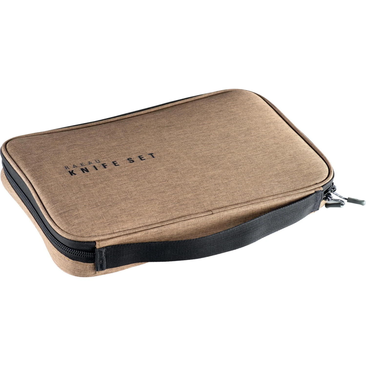 Fein aufgereiht in der Tasche und jederzeit bereit für den Einsatz ist das Rakau Knife Set von GSI. Drei Messer (Gemüsemesser aus Edelstahl mit Holzgriff, Santoku Chefmesser aus Edelstahl mit Holzgriff, Brotmesser aus Edelstahl mit Holzgriff) mit Klingenschutz, einem Schleifstein für die Messer, Schneidbrett mit Rinne aus Bambus, Wischtuch aus recyceltem Polyester und einer Packtasche aus recyceltem PET handlich und klein im Packmaß verpackt.