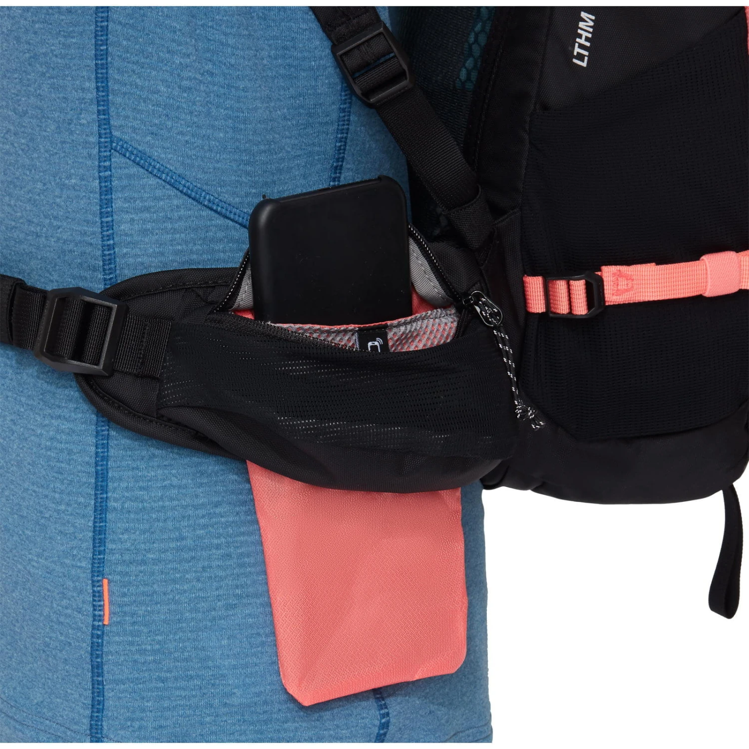 | Merkmale | ausklappbare Handytasche auf einem Hüftflügel, Brustgurt mit Signalpfeife, Einschubfach innen, Frontfach mit Reißverschluss, gepolsterter Hüftgurt, Halterung für Trinkblase, höhenverstellbarer Brustgurt, integrierte Regenhülle in separater Reißverschlusstasche am Boden, kleine Einschubtasche aus Mesh auf einem Hüftflügel, reflektierende Elemente, Reißverschlusstasche auf einem Hüftflügel, Reißverschlusstasche oben, Schlauchdurchführung für Trinksystem, Schlüsselhalterung, seitliche Kompressionsriemen, Stockhalterung, Tragegriff oben, zwei seitliche Netztaschen |