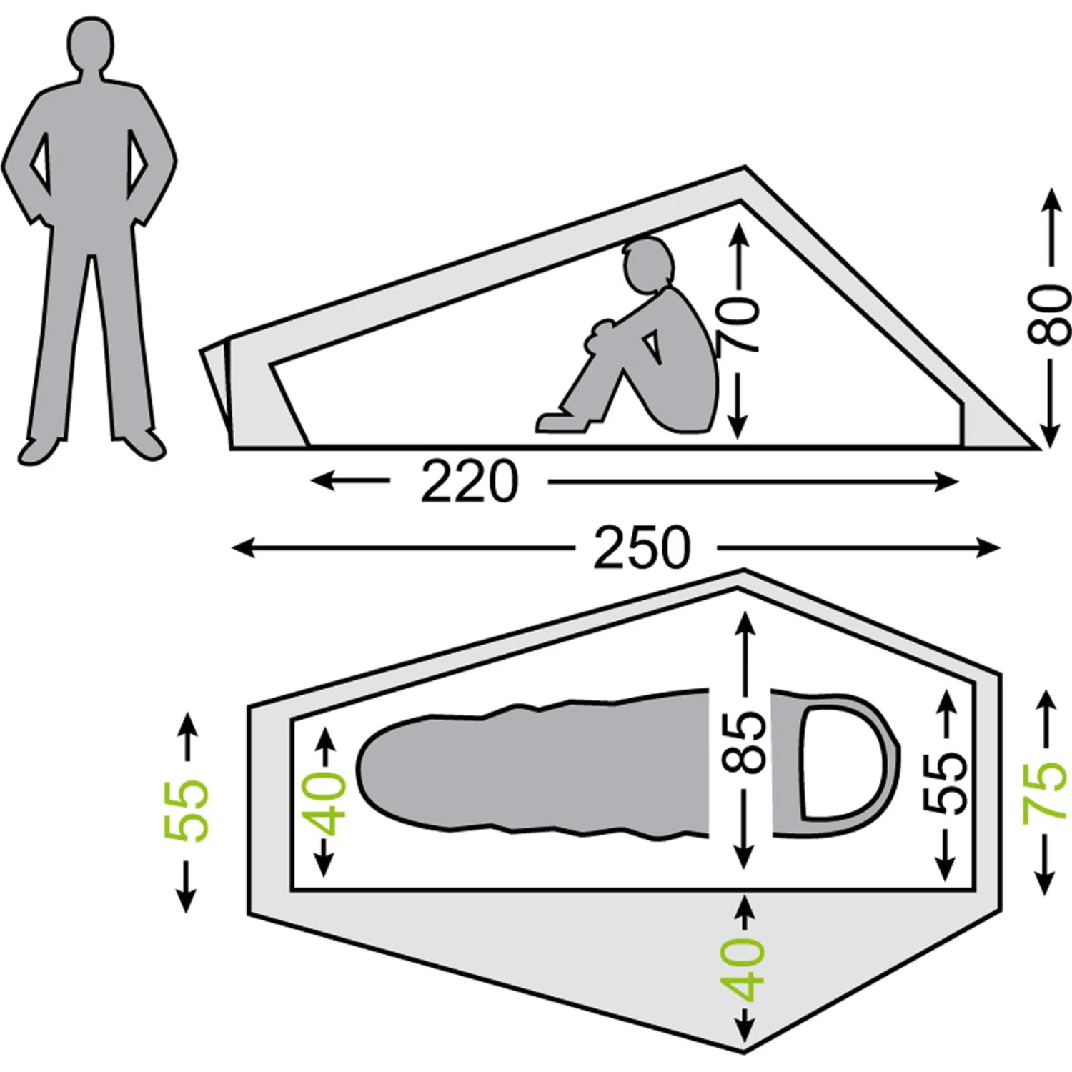 | Maße Außenzelt ca. | 250 x 55 – 125 x 80 cm |
