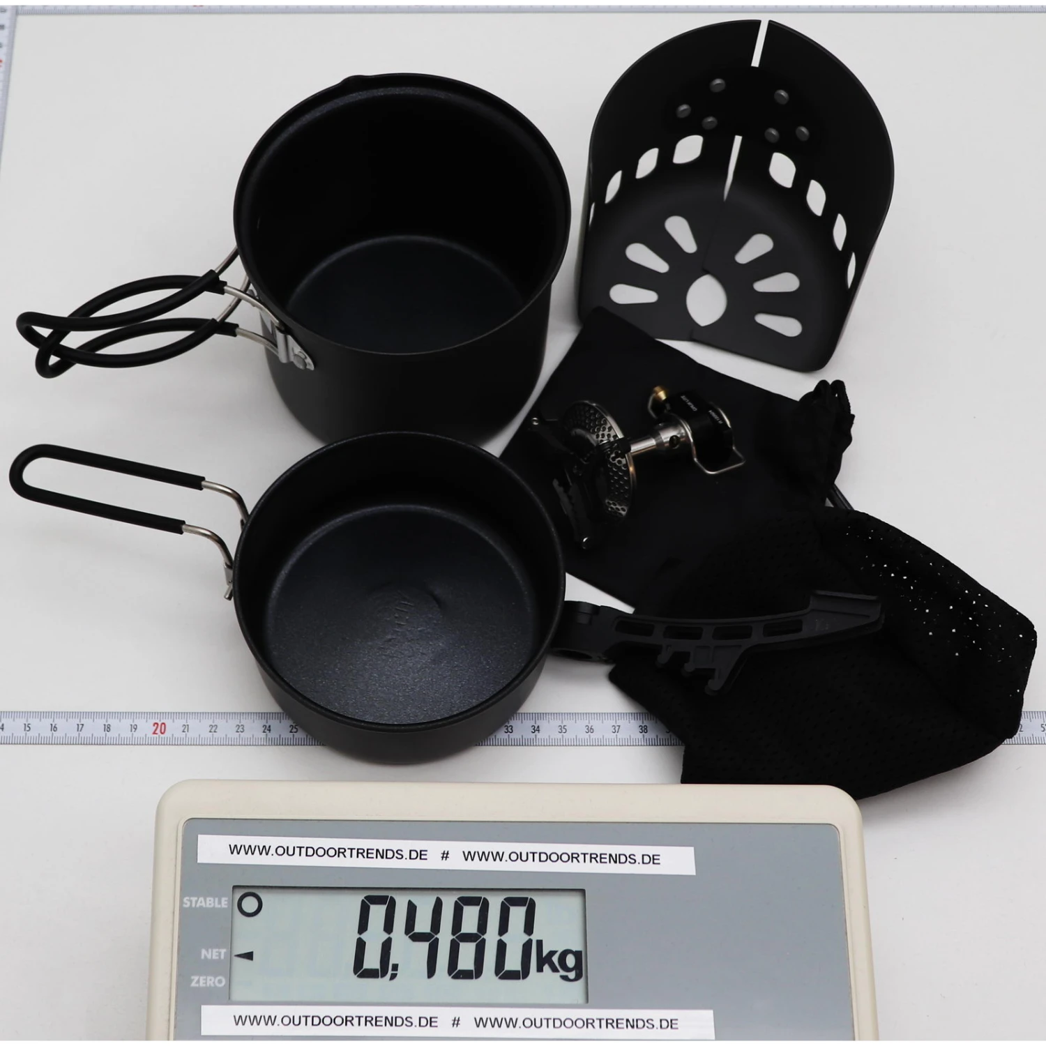 | Gewicht ca. | Brennerbeutel: 10 g, Packsack: 18 g, Stützfuß: 25 g, Crux Lite Brenner: 78 g, Windschutz: 88 g, Topf und Pfanne/Deckel: 261 g, 480 g |