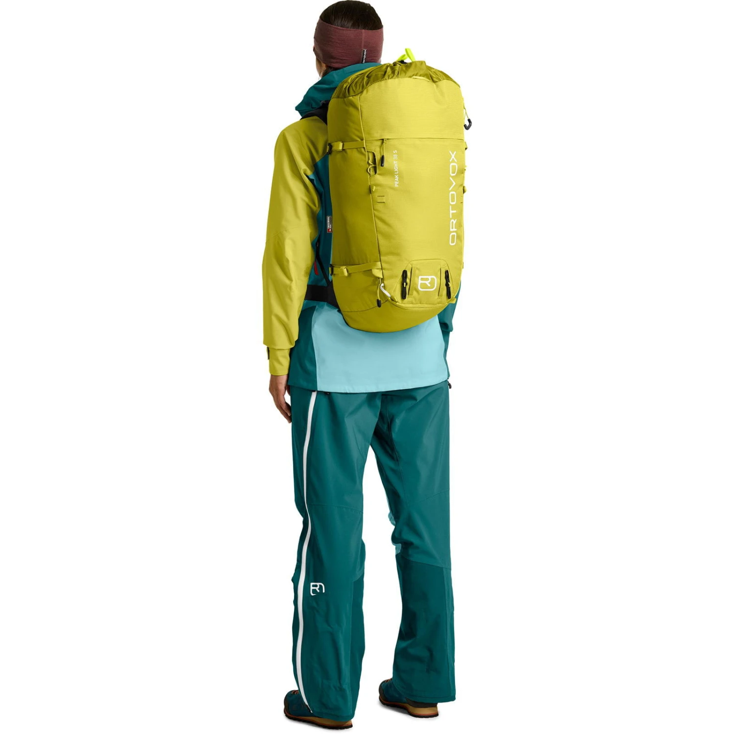 Der Peak Light 38 S von Ortovox ist der ideale Begleiter für anspruchsvolle Hochtouren. Der Tourenrucksack überzeugt durch alle wichtigen Befestigungsmöglichkeiten, sein minimalistisches Design und sein geringes Gewicht. Er ist extrem leicht, technisch und mit dem innovativen SWISSWOOL HYBRID-Rückensystem noch funktionaler. An den besonders beanspruchten Kontaktbereichen sorgen drei weiche SWISSWOOL Pads für ein angenehmes Tragegefühl und ein gutes Körperklima, indem sie viel Feuchtigkeit aufnehmen, ohne sich dabei nass anzufühlen. Dies ermöglicht ein hervorragendes Temperaturmanagement und höchsten Tragekomfort. Features wie Hüftgurt, Deckel, Rückenverstärkung, diagonale Ski- und Pickelhalterung können komplett abgenommen werden, damit steht der Peak Light 38 S für minimales Gewicht bei maximaler Funktion. Der Zugang von oben und der praktische, umlaufende Frontreißverschluss ermöglichen einen direkten und schnellen Zugriff auf das Hauptfach und die Notfallausrüstung. Der Deckel bietet sowohl innen als auch außen ein Fach für Kleinteile oder Wertsachen. Ein Reißverschlussfach auf der Vorderseite und eine Tasche am Hüftgurt bieten zusätzlichen Stauraum. Darüber hinaus verfügt der Peak Light 38 S über zahlreiche Befestigungsmöglichkeiten für Seil, Pickel, Helm, Ski und Stöcke. Der Helm kann auf zwei Arten befestigt werden, klassisch an der Front und neu auch auf dem Deckel. Ganz im Sinne der Nachhaltigkeit bestehen die beiden Hauptaußenmaterialien aus 100% bzw. 50% recyceltem Polyamid, was den Rucksack extrem robust, strapazierfähig und langlebig macht und gleichzeitig einen möglichst geringen ökologischen Fußabdruck hinterlässt. Die durchdachte Ausstattung, das geringe Gewicht und das innovative Rückensystem machen den Peak Light 38 S zu einem hochfunktionellen Alpinrucksack, bei dem Verzicht mehr Funktion bedeutet.