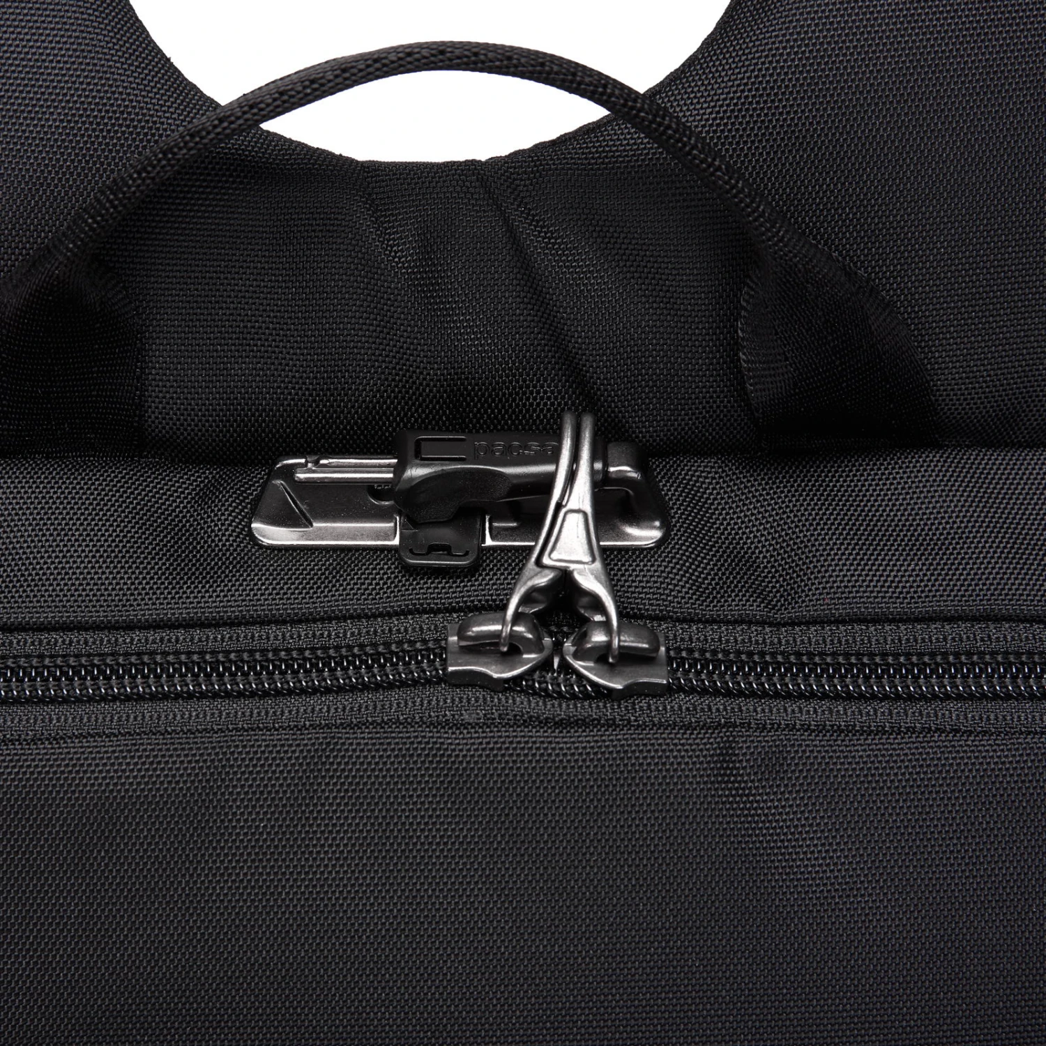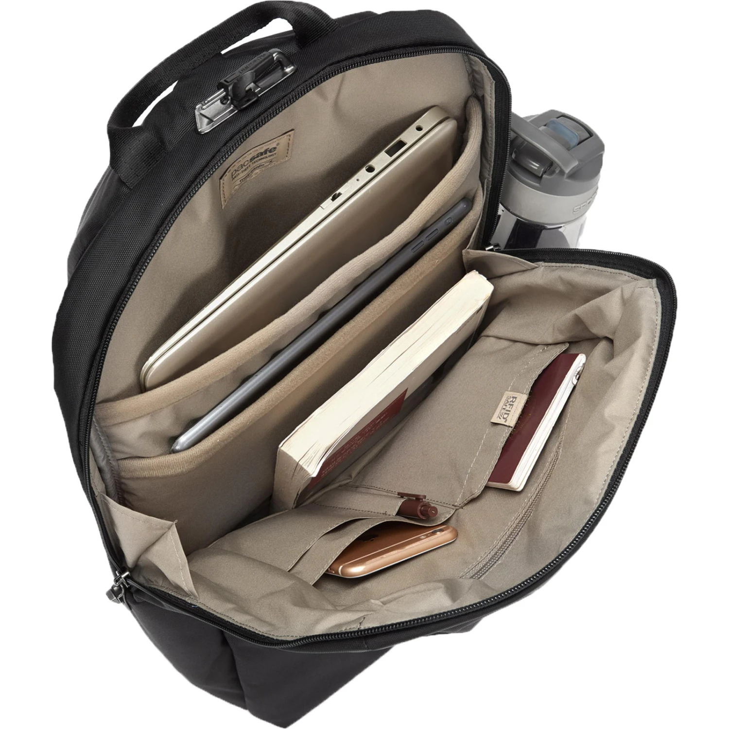 Der Metrosafe X 20 L von pacsafe ist ein geräumiger 20-Liter-Rucksack mit smarten Sicherheitsfunktionen. Das schlanke Design macht den Tages- und Pendler-Rucksack zum perfekten Begleiter durch belebte Bereiche wie U-Bahn, Städte oder Flughäfen. Ausgestattet mit den besten pacsafe Anti-Diebstahl-Merkmalen, wie schnittfestem Gewebe, abschließbaren Reißverschlüssen, RFID-blockierendes Fach und die Sicherungsmöglichkeit an Gegenständen schützt der Rucksack die Wertsachen und Identität. Ineinandergreifende Reißverschlussschieber und das Roobar Sport Verriegelungssystem können können mehrere Fächer verriegeln und den Inhalt mit einem zusätzlichen Schloss (nicht im Lieferumfang enthalten) sichern. Das RFIDsafe Fach verhindert das kontaktlose Auslesen von Daten und mit dem PopNLock security clip Verschluss lässt sich die Tasche schnell und unkompliziert an einem festen Gegenstand oder Objekt sichern. Die große Reißverschluss-Öffnung macht es einfach, den Inhalt in allen Fächern und Taschen gut zu organisieren. Separate, weich gepolsterte Einschubfächer bieten Platz für einen 16″-Laptop und ein 10″-Tablet. Außerdem bietet der Metrosafe X 20 L eine versteckte Reißverschlusstasche auf der Rückseite, zwei große Frontfächer, eine seitliche Einschubtasche für Trinkflaschen und eine Gurtschlaufe zum Befestigen am Koffer. Der Laptoprucksack wird aus recycelten Plastikflaschen hergestellt und ist zu 100% PFC-frei und wasserabweisend.