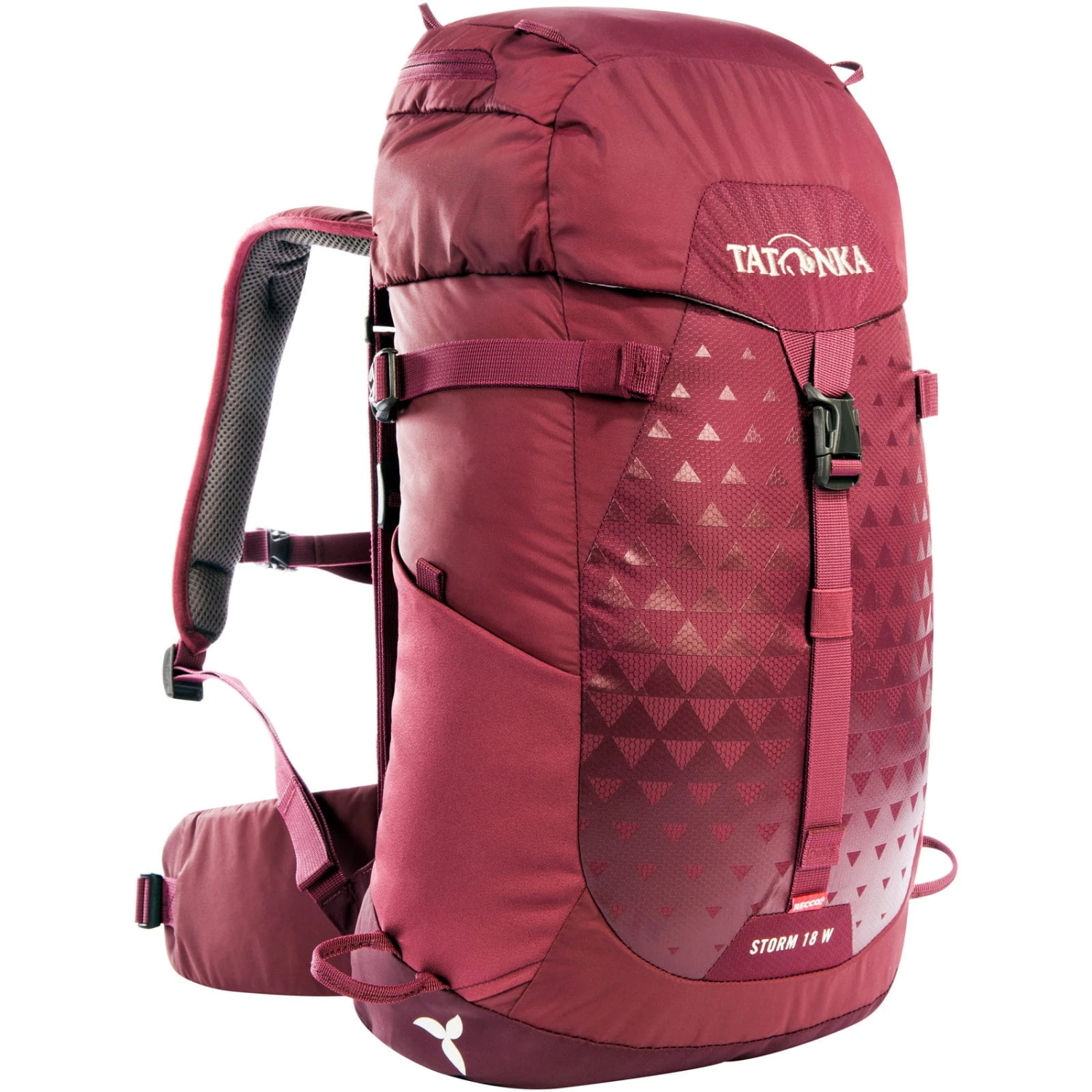 Der kompakte Wanderrucksack Storm 18 Women Recco von Tatonka für Damen besitzt mit 18 Liter Volumen die optimale Größe für kleinere Tagestouren. Das leichte X Vent Zero-Tragesystem bietet beste Belüftung durch minimalen Kontakt mit dem Rücken. Zwei x-förmige Fiberglasstäbe stellen in Verbindung mit verstellbaren Gurtbändern die tragende Verbindung zum Rucksack her. Das System kann stufenlos auf- und abgespannt und somit individuell eingestellt werden. Auch eine kraftschlüssige Positionierung in Rückennähe ist möglich. Die leichte Aufpolsterung im Lendenbereich, die gepolsterten Schultergurte mit frauenspezifischem Schnitt, der gepolsterte Hüftgurt sowie der verstellbare Brustgurt sorgen für einen komfortablen und festen Sitz am Rücken. Der Storm 18 Women Recco Toplader-Rucksack ist unter anderem mit einer Trinksystemvorbereitung, zwei Deckelfächern, seitlichen Netztaschen, einer Stockhalterung und Materialschlaufen am Deckel ausgestattet. Die mitgelieferte Regenhülle schützt Rucksack und Inhalt zuverlässig bei schlechtem Wetter. Zusätzlich ist der Damen-Wanderrucksack mit dem RECCO®-Notfall-Reflektor ausgestattet. Dieses wichtige Sicherheitsfeature ist auf dem Deckel angebracht und sorgt dafür, dass man von Rettungsorganisationen schnell und sicher geortet wird, auch wenn das Handy nicht funktioniert oder man selbst nicht weiß, wo man sich befindet. Der RECCO®-Reflektor funktioniert ohne Strom oder Batterie, ist immer lokalisierbar und wartungsfrei.